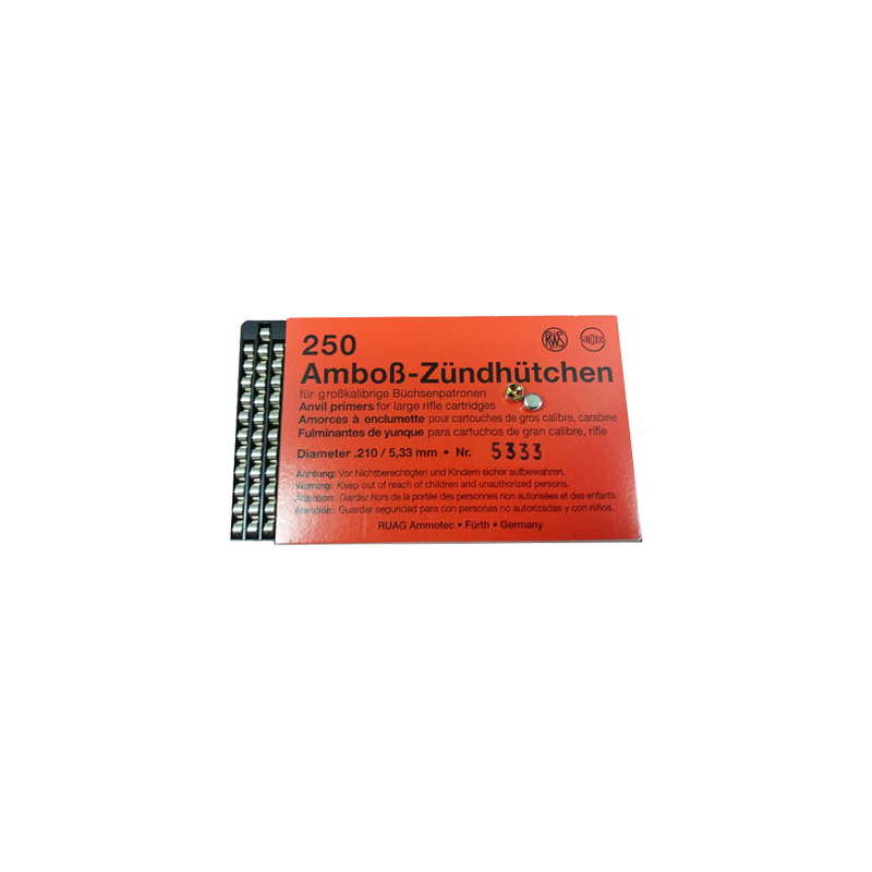 Scatola da 250 inneschi RWS tipo Large Rifle nr. 5341 diametro 5,33mm per ricaricare le munizioni da carabina.